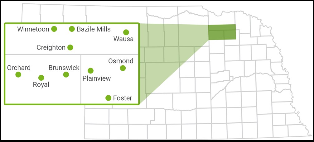 The Bazile Groundwater Management Area (BGMA) comprises of four NRDs including Lewis & Clark NRD, Lower Elkhorn NRD, Lower Niobrara NRD, and the Upper Elkhorn NRD. Within these four NRDs, contains three counties: Antelope, Knox and Pierce and the towns of Brunswick, Creighton, Orchard, Osmond, Plainview, Royal, Wausa, and Winnetoon. The Bazile GWMA was started by local producers and the NRDs to address rising nitrate levels in area communities and domestic wells. Currently, Creighton, Orchard, and Osmond are under an administrative order for high nitrate concentrations in public drinking water.