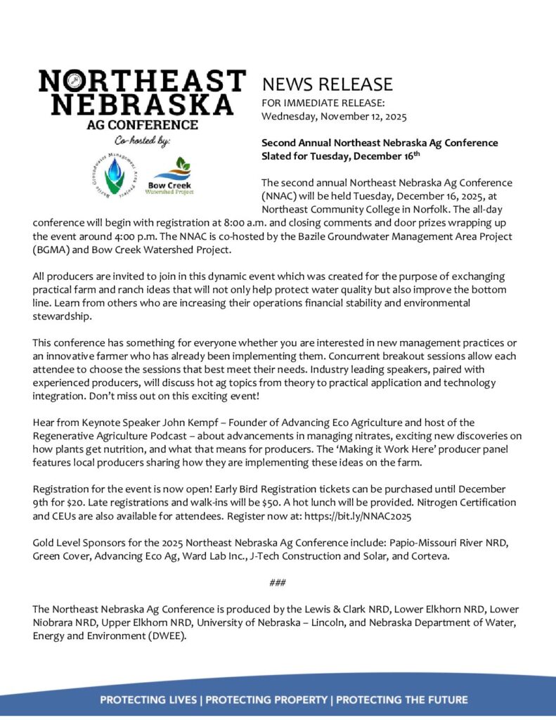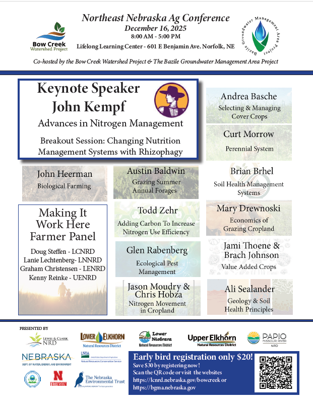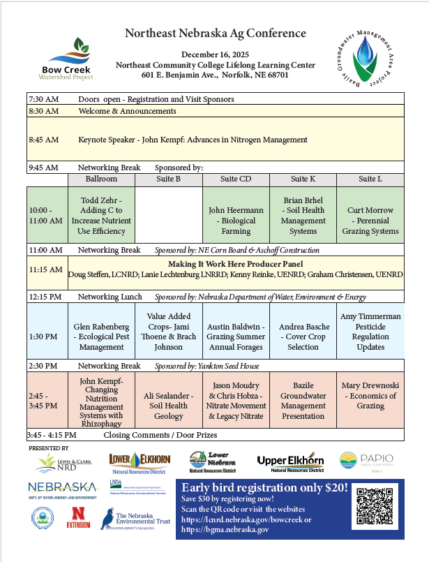 The Northeast Nebraska Ag Conference was co-hosted by the Bow Creek Watershed Project (Lewis & Clark NRD) and the Bazile Groundwater Management Area (LCNRD, LENRD, LNNRD, and UENRD), Nebraska Department of Natural Resources, Nebraska Strategic Ag Coalition, and USDA Natural Resources Conservation Service. Partners include Nebraska Department of Environment and Energy / EPA, Nebraska Extension, Nebraska Environmental Trust, UNL and Nebraska Game and Parks Commission.